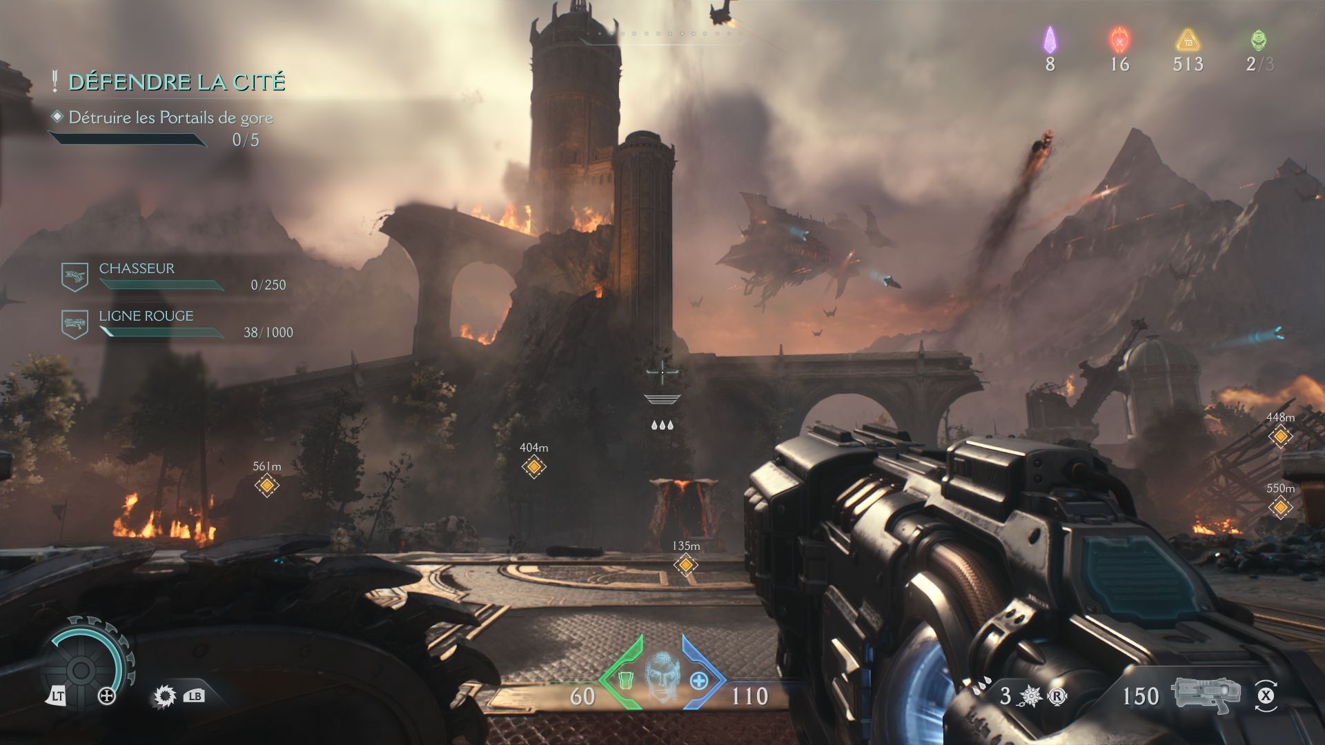Les nouveautés de DOOM: The Dark Ages ne changent en rien le gameplay ultra addictif que nous connaissons tous. Les deux premiers niveaux peuvent sembler moins nerveux que ses prédécesseurs, mais il n’en est rien tant ID Software a fait le job. En effet, tous les choix précités offrent une osmose et rendent son gameplay ultra nerveux. Le sentiment de puissance du Slayer est immédiat, surtout avec son bouclier nous rappelant un personnage Marvel (Captain America). Côté armement, le cuvée 2025 ne fait pas dans la dentelle avec une douzaine d’armes, allant du Fusil de combat aux Lance-grenades et Lance-roquettes, liés a deux succès majeurs du jeu. Vous pourrez bien évidemment améliorer vos armes via trois ou quatre niveaux, en trouvant de l’or au fur et à mesure de votre progression. La mécanique globale du jeu est vraiment à saluer, avec un meilleur équilibrage des armes qu’avec DOOM: Eternal.
